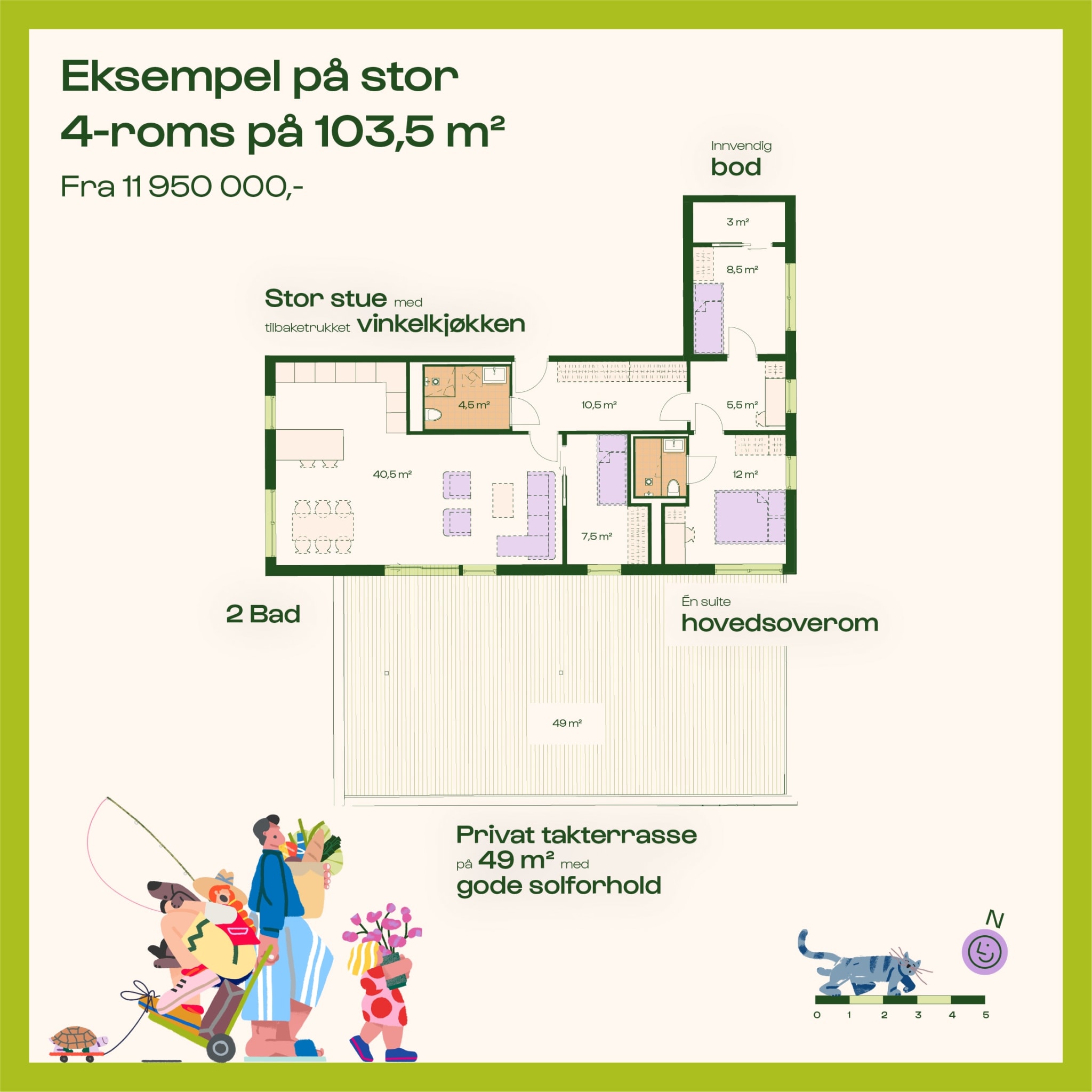 Det blir også et bredt utvalg av familievennlige 4-roms leiligheter, fra arealeffektive på 75 kvm til romslige på opptil 100 kvm. Mange leiligheter på bakkeplan får store markterrasser - perfekt for barnefamilier. I tillegg kommer det leiligheter med egen utleiedel og flotte toppleiligheter med private takterrasser.