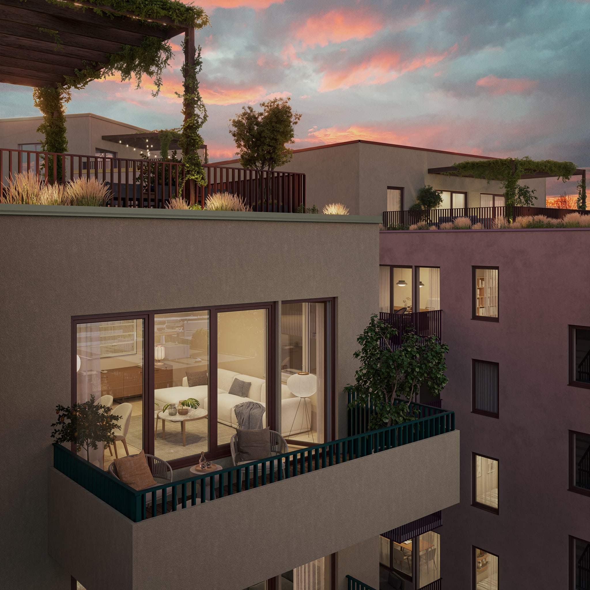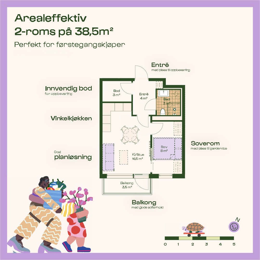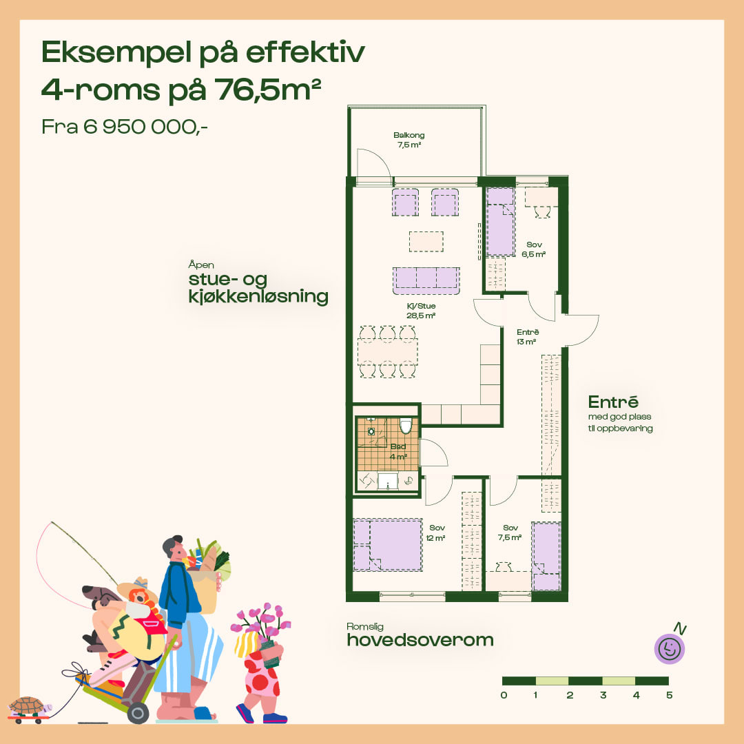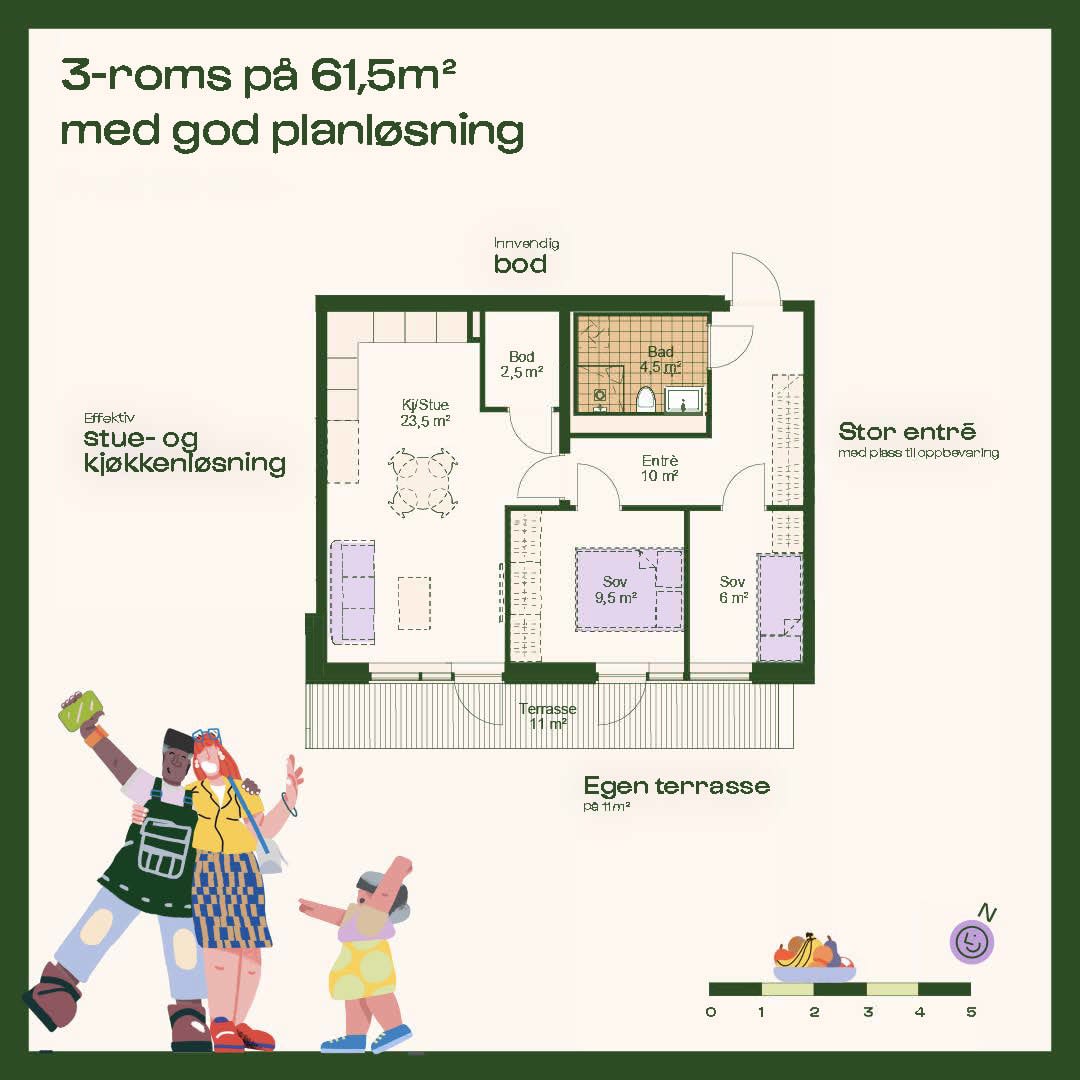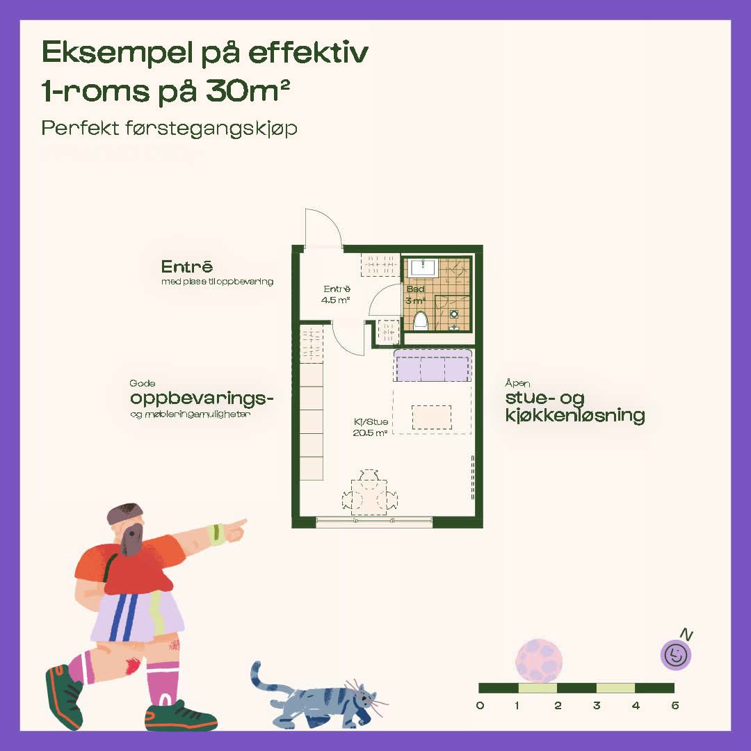 Nå kan du sikre deg en moderne bolig i ulike størrelser og prisklasser – fra arealeffektive 1-roms på 30 kvm og smarte 2-roms på 35–42 kvm, til funksjonelle 3-roms fra 50 kvm. For familier tilbys det romslige 4-roms leiligheter, fra 75 til 100 kvm. Mange av leilighetene på bakkeplan får store markterrasser, og det kommer også boliger med utleiedel og flotte toppleiligheter med private takterrasser.