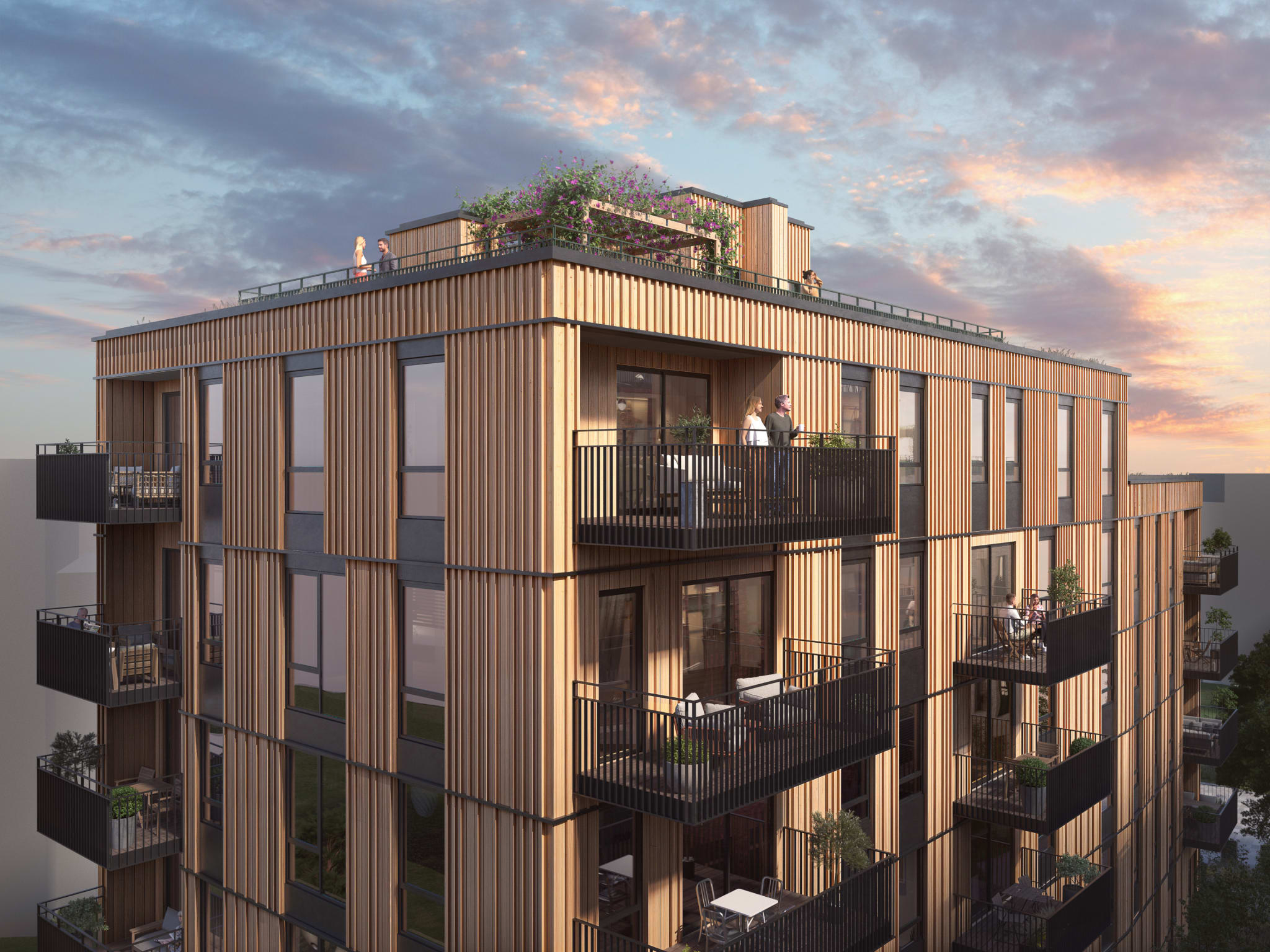De fleste leilighetene har sin egen private balkong eller terrasse, og noen av boligene har også privat takterrasse.